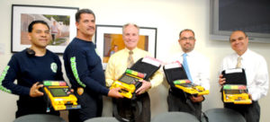 On Thursday, April 23rd, Mariposa Community Health Center’s (MCHC) Chief Executive Officer, Jim Welden and Medical Director, Eladio Pereira, M.D., presented the Nogales Sonora Fire Department with four automated external defibrillators (AEDs). Nogales Sonora Fire Department Captain Sergio Diaz Regalado and Lieutenant Victor Garay accepted the donation and expressed their gratitude to MCHC for providing their Fire Department with the much needed defibrillators. The AEDs will be provided to the fire stations with ambulance service and include: Downtown Central Base, Station West and East and the Nogales Base Cruz Roja. Each of the stations responds to all types of calls, but over 95% are related to cardiac or trauma related medical emergencies. A special thanks to MCHC Laboratory Manager, Gabe Martinez, who coordinated the donation.
